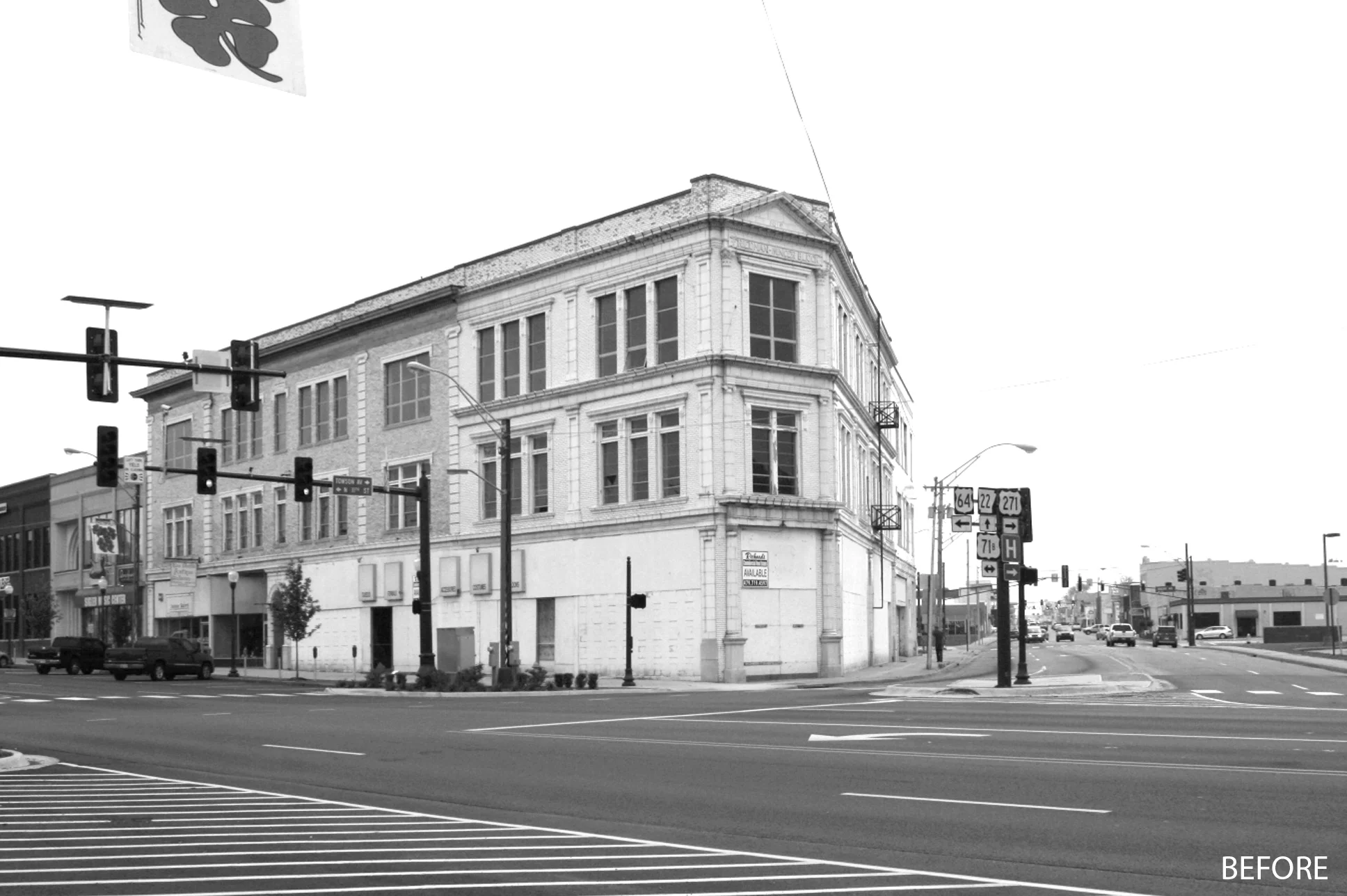 Built in 1912, the Friedman-Mincer building occupies a prominent intersection, Texas Corner, in downtown Fort Smith. Vacant for over 15 years and abandoned by the previous owner after being denied a demolition permit by the City, the building was purchased in a derelict condition, including a partial collapse of the roof and third floor, leaving only the exterior load bearing brick walls and the interior wood columns, beams, and joists.